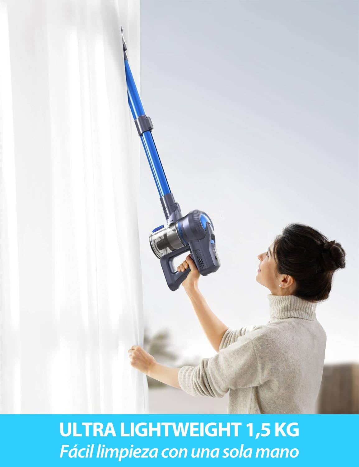 - LIGERA Y FÁCIL DE GUARDAR: Con un peso de tan solo 1,5 kg y un diseño ergonómico, reduce la fatiga física a la vez que limpia eficazmente. Es ideal para limpiar lugares de difícil acceso, como techos y cortinas; la aspiradora se mantiene de pie sin soporte, lo que facilita su uso y almacenamiento en cualquier momento, ahorrando espacio.